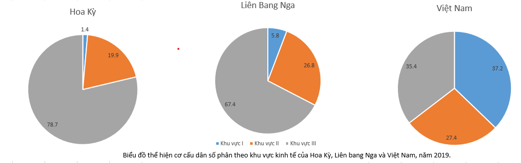 Hoa Kì dân số làm việc chủ yếu tại khu vực III (78,7%) cao gấp 2,2 lần so với dân số làm việc trong khu vực III của Việt Nam, ngược lại tại Việt Nam tỉ lệ dân làm việc khu vực I còn rất cao (37,2%) gấp 26,6 lần Hoa Kì và  6,4 lần Liên Bang Nga.
