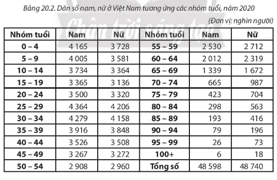 Cho bảng số liệu 20.2, em hãy tính cơ cấu dân số theo giới tương ứng với 3 nhóm tuổi của Việt Nam để hoàn thành bảng bên dưới
