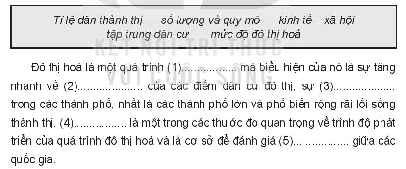Đọc kĩ đoạn văn, đọc lại kiến thức về khái niệm đô thị hóa để điền các cụm thích hợp cho trước từ vào chỗ chấm.