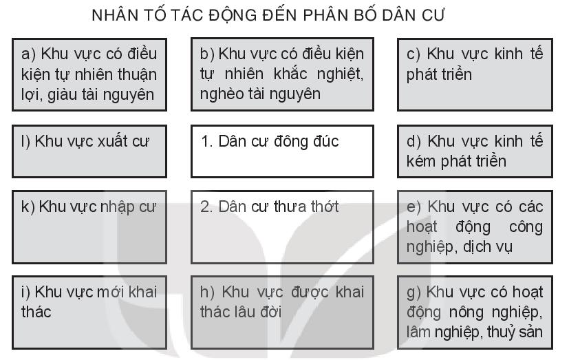 – Dựa vào kiến thức đã học về các nhân tố tác động đến sự phân bố dân số để nối cho phù hợp