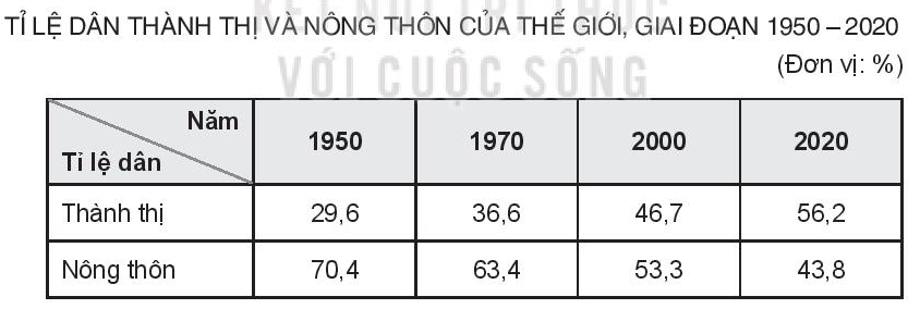– Vẽ biểu đồ thể hiện sự thay đổi tỉ lệ dân thành thị và nông thôn thế giới giai đoạn 1950 – 2020.