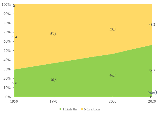 – Năm 2020, tỉ lệ dân nông thôn chỉ đạt 43,8%, giảm 26,6% so với năm 1950.