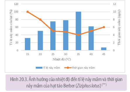 Dựa vào Hình 20.3, chỉ ra mối quan hệ giữa nhiệt độ với tỉ lệ nảy mầm và thời gian nảy mầm của hạt.