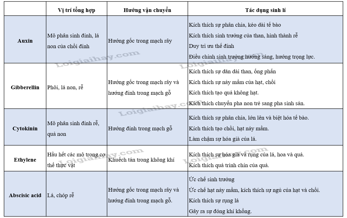 Lập bảng chỉ ra đặc điểm của các loại hormone về vị trí tổng hợp, hướng vận chuyển và tác dụng sinh lí của mỗi loại.
