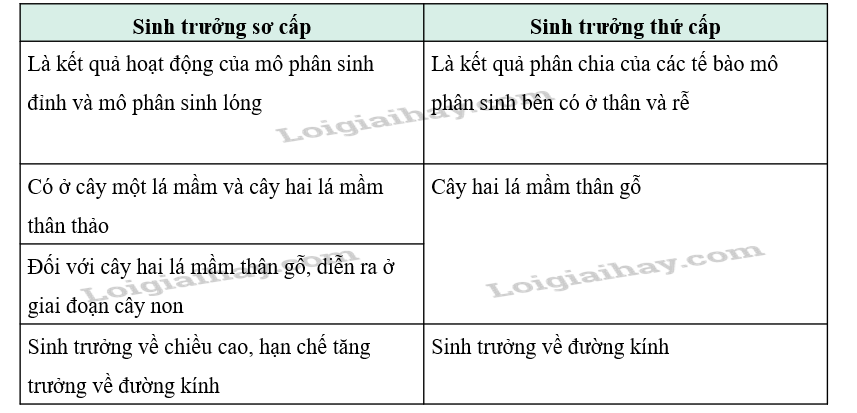 Lập bảng phân biệt sinh trưởng sơ cấp và sinh trưởng thứ cấp.