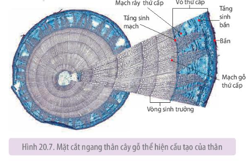 Quan sát lát cắt ngang của thân cây gỗ ở Hình 20.7 và cho biết cách xác định tuổi của cây. Có thể sử dụng vòng gỗ để tìm hiểu về đặc điểm khí hậu (lượng mưa, nhiệt độ) ở địa phương nơi thực vật đó sinh sống được không? Giải thích.