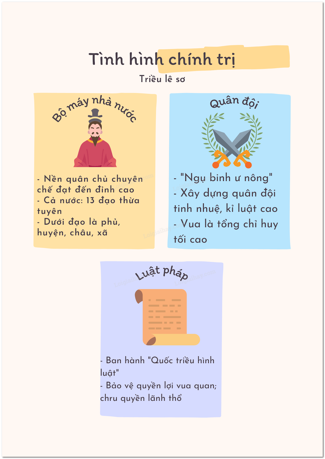 Đọc thông tin và tư liệu, hãy nêu những nét chính về tổ chức bộ máy nhà nước, quân đội, luật pháp của Đại Việt thời Lê sơ.