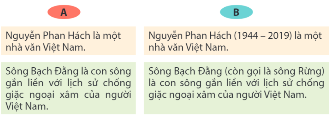 Các câu ở cột B có các dấu ngoặc đơn chỉ chú thích cho chủ ngữ của câu, đầy đủ hơn so với cột A.