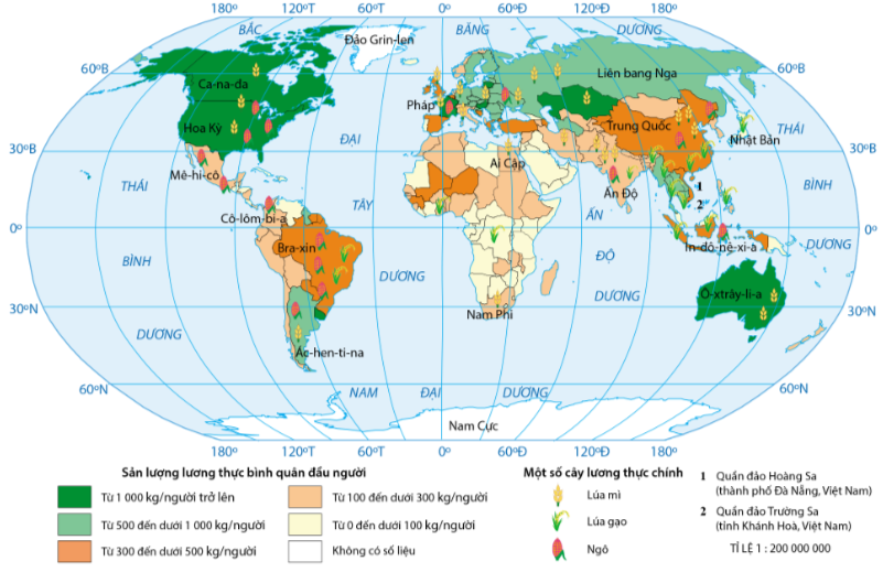 Hình 21.1. Bản đồ phân bố một số cây lương thực và sản lượng lương thực bình quân đầu người trên thế giới trung bình giai đoạn 2015 – 2019