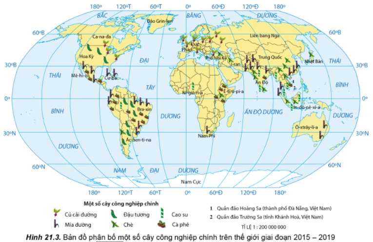 Đọc thông tin và quan sát hình 21.3, hãy nhận xét và giải thích sự phân bố các cây công nghiệp chính trên thế giới.
