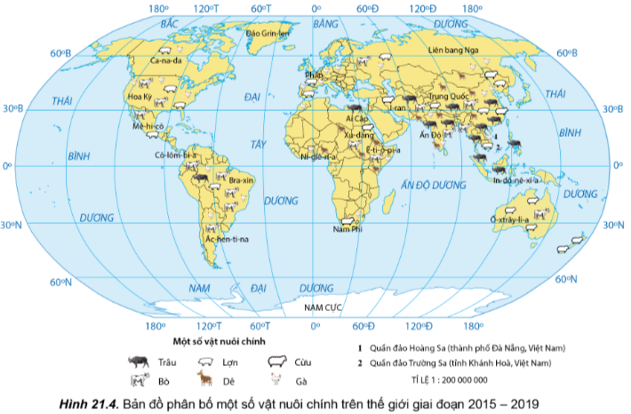 Đọc thông tin và quan sát hình 21.4, hãy nhận xét và giải thích sự phân bố của một số vật nuôi chính trên thế giới.