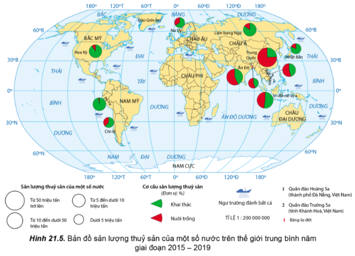 – Kể tên những nước có sản lượng thủy sản từ 5 triệu tấn đến dưới 10 triệu tấn, từ 10 triệu tấn đến dưới 50 triệu tấn và từ 50 triệu tấn trở lên. Nhận xét và giải thích sự phân bố đó.