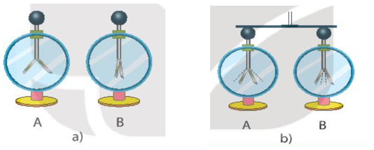 Có hai điện nghiệm, điện nghiệm A được tích điện nên hai lá kim loại xoè ra; điện nghiệm B không tích điện nên hai lá điện nghiệm cụp lại (Hình a). Nối hai quả cầu của hai điện nghiệm, hiện tượng xảy ra: hai lá kim loại của điện nghiệm A giảm độ xoè, hai lá kim loại của điện nghiệm B xoè ra (Hình b). Kết quả thí nghiệm chứng tỏ điều gì?
