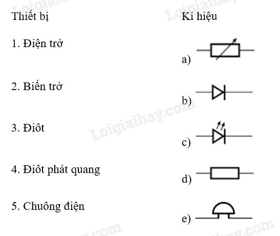 Ghép tên của các thiết bị ở cột bên trái với kí hiệu tương ứng của chúng khi biểu diễn trong sơ đồ mạch điện ở cột bên phải.