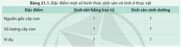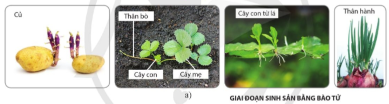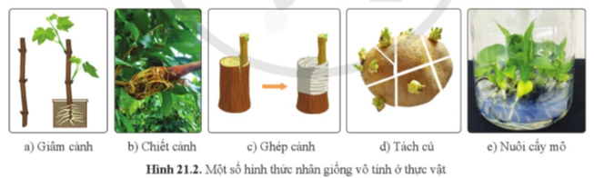 Ở hình 21.1a, cây con được hình thành từ một phần của cơ thể mẹ như củ, thân, lá, … nhờ quá trình nguyên phân.