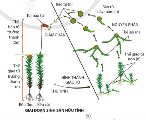 Ở hình 21.1b, bào tử (n) sau khi được phát tán từ túi bào tử bắt đầu nảy mầm và nguyên phân nhiều lần tạo thành thể sợi (n), sau đó phát triển thành thể giao tử non (n).