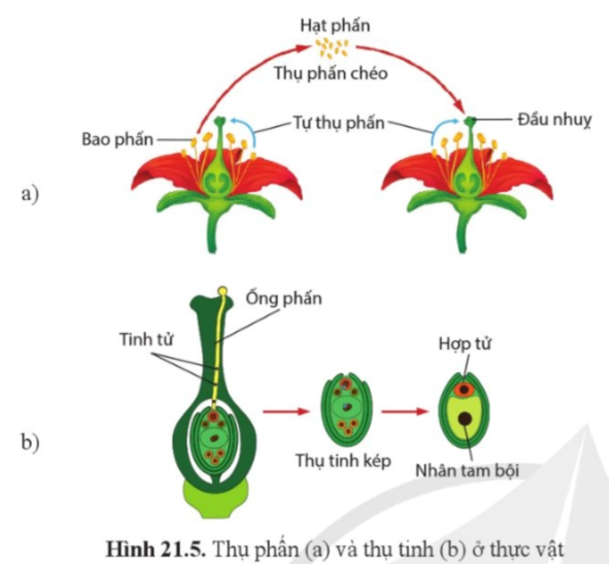 CH 1: Quan sát hình 21.5, mô tả sự phát tán của hạt phấn đến đầu nhụy.