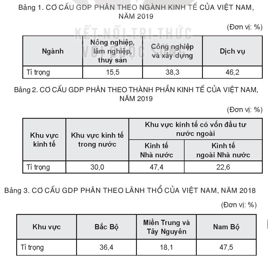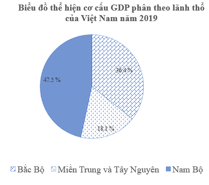 – Biểu đồ cơ cấu GDP phân theo lãnh thổ: cho biết mối quan hệ của các bộ phận lãnh thổ hợp thành nền kinh tế. Phản ánh trình độ phát triển, thế mạnh đặc thù của mỗi lãnh thổ: dựa vào biểu đồ có thể thấy các lãnh thổ nước ta phát triển không đồng đều. 2 vùng Bắc Bộ và Nam Bộ có đóng góp lớn vào GDP nền kinh tế trong đó Nam Bộ dẫn vai trò đầu tàu, Miền Trung và Tây Nguyên còn đóng góp khiêm tốn.
