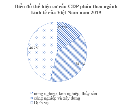 + Biểu thị tỉ trọng, vị trí và mối quan hệ giữa các ngành trong nền kinh tế: trong cơ cấu kinh tế theo ngành của Việt Nam năm 2019 ngành nông nghiệp chiếm tỉ trọng thấp nhất nhưng còn cao, dịch vụ chiếm tỉ trọng cao nhất.