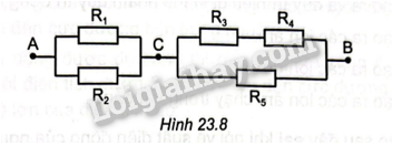 Cho mạch điện như Hình 23.5. Giá trịcác điện trở: \({R_1} = 5\Omega \),\({R_2} = 7\Omega \),\({R_3} = 1\Omega \), \({R_4} = 5\Omega \),\({R_5} = 3\Omega \). Hiệu điện thế giữa hai đầu đoạn mạch \({U_{AB}} = 21V\)