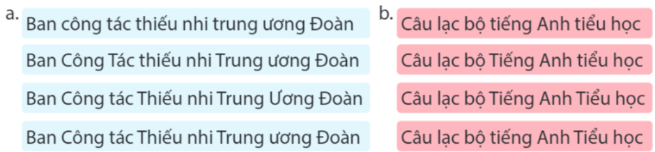 Nêu sự khác nhau về cách viết hoa tên người với tên cơ quan, tổ chức dưới đây. Nhận xét cách viết hoa tên cơ quan, tổ chức sau. Trường hợp nào dưới đây viết hoa đúng tên cơ quan, tổ chức. Viết.