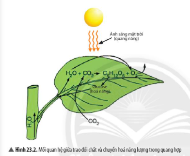 1. Quan sát Hình 23.1, hãy cho biết các chất tham gia và các chất được tạo thành trong quá trình quang hợp.