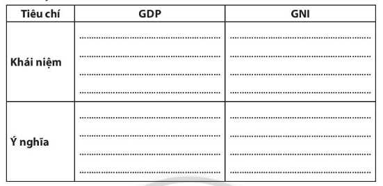 Em hãy hoàn thiện thông tin so sánh giữa GDP và GNI trong bảng dưới đây