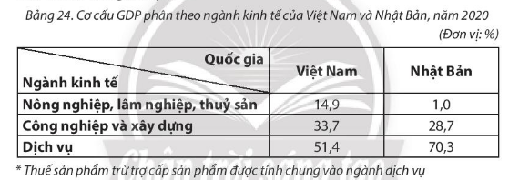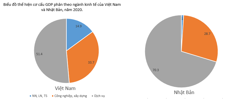 – Trong cơ cấu kinh tế tỉ trọng ngành dịch vụ của Nhật Bản cao hơn Việt Nam, ngành công nghiệp, xây dựng và dịch vụ Việt Nam có tỉ trọng cao hơn so với Nhật Bản.