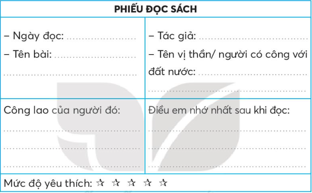 Đọc câu chuyện về một vị thần trong kho tàng truyện cổ Việt Nam (hoặc người có công với đất nước) và viết thông tin vào phiếu đọc sách.