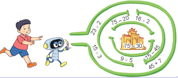 Tìm đường đi qua mê cung để tới tòa thành theo các phép tính có kết quả bằng 45.