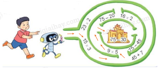 Tìm đường đi qua mê cung để tới tòa thành theo các phép tính có kết quả bằng 45.