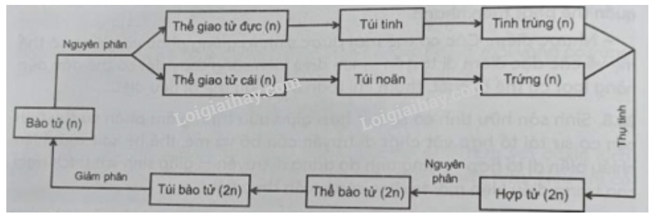 A. Tế bào mẹ trong bao phấn giảm phân cho bốn bào tử đơn bội → một bào tử đơn bội nguyên phân một lần cho một hạt phấn chứa một tế bào sinh sản và một tế bào ống phấn → tế bào sinh sản giảm phân tạo bốn giao tử đực.