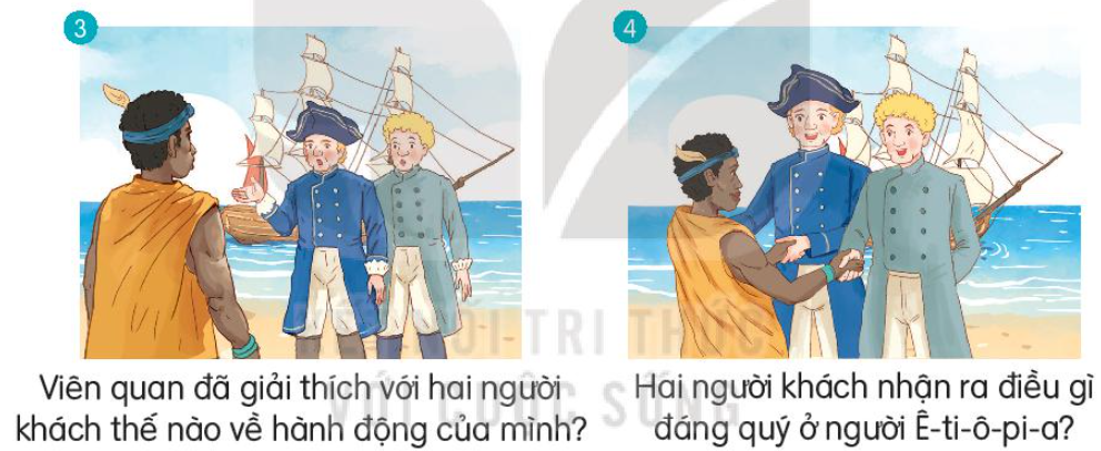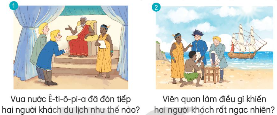 Ngày xưa, có hai người khách du lịch đến nước Ê-ti-ô-pi-a. Họ đi khắp đất nước thăm đường sá, núi đồi, sông ngòi. Vua nước Ê-ti-ô-pi-a mời họ vào cung điện, mở tiệc chiêu đãi và tặng họ nhiều vật quý. Sau đó vua sai một viên quan đưa khách xuống tàu.