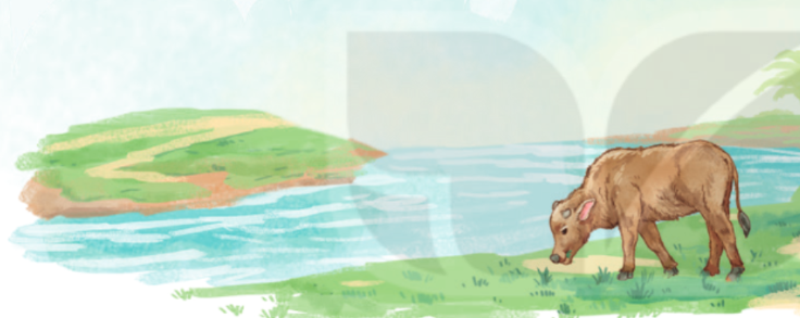 c. Chú nghé con đang ở mấy nhánh cỏ non.
