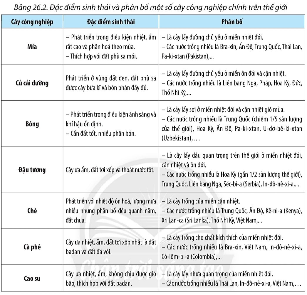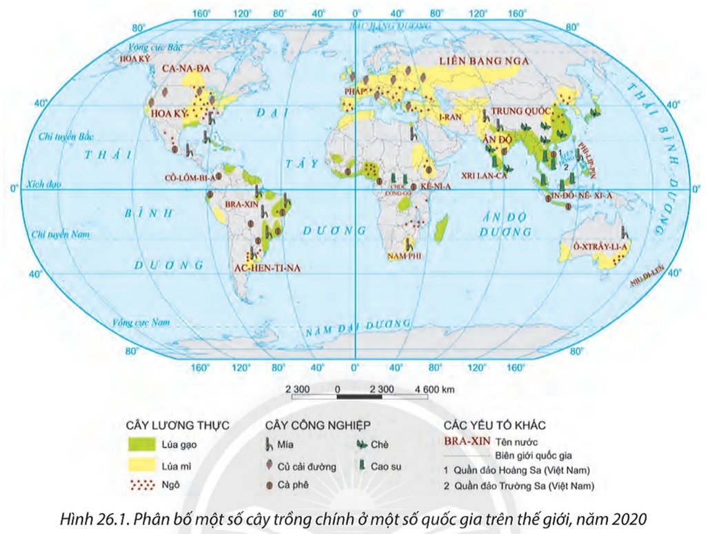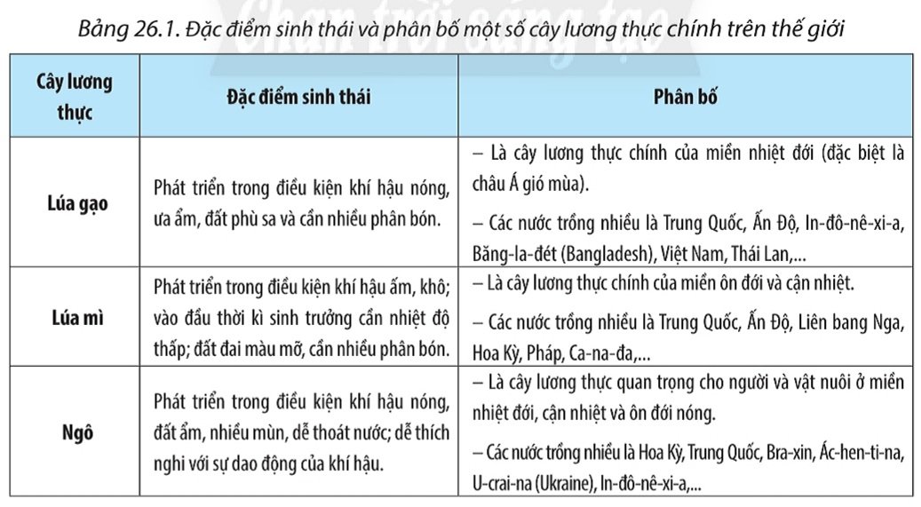 Quan sát hình 26,1, bảng 26.1, 26.2 và đọc thông tin mục 1b (Một số cây trồng chính trên thế giới).