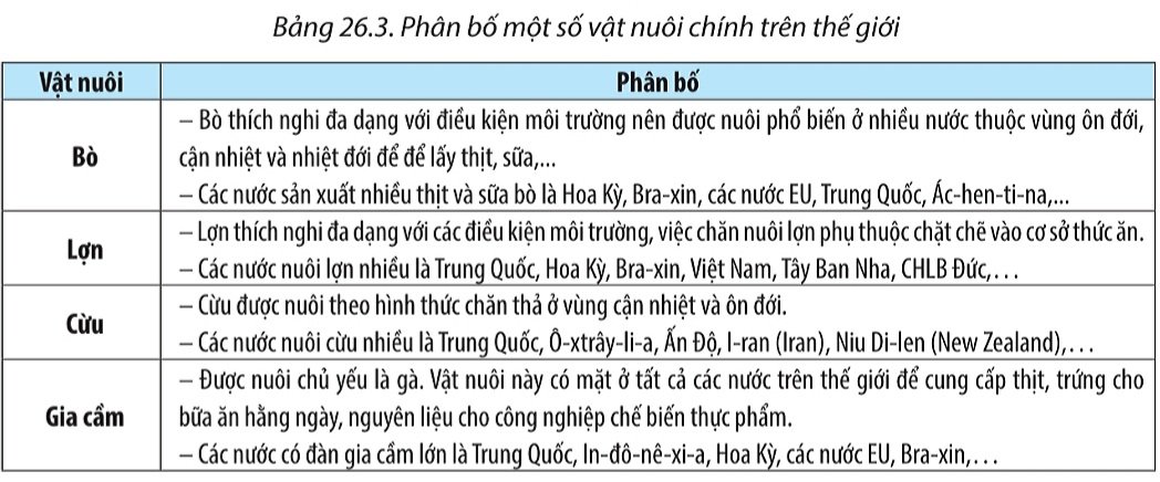 Dựa vào hình 26.2, bảng 26.3 và những hiểu biết của bản thân, em hãy trình bày và giải thích sự phân bố một số vật nuôi chính trên thế giới.