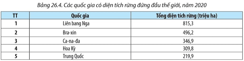 Dựa vào bảng 26.4, thông tin trong bài và hiểu biết của bản thân, em hãy trình bày sự phân bố lâm nghiệp trên thế giới.
