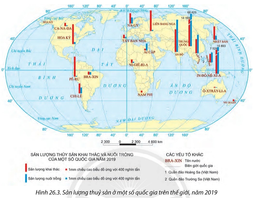 Quan sát hình 26.3, đọc thông tin mục 2 (Phân bố sản xuất thủy sản trên thế giới) kết hợp hiểu biết của bản thân.