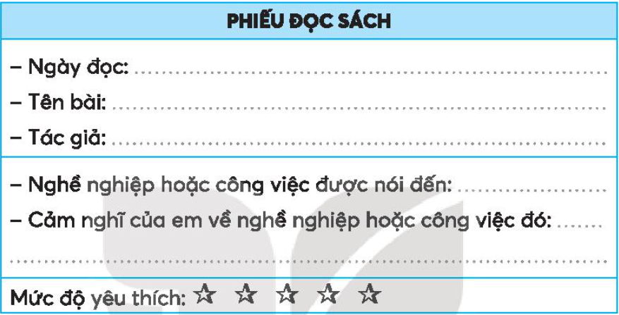 Đọc câu chuyện, bài văn, bài thơ,… về nghề nghiệp hoặc công việc nào đó và viết thông tin vào phiếu đọc sách.