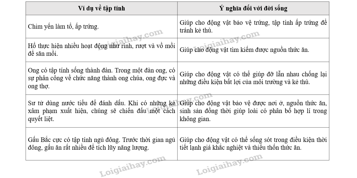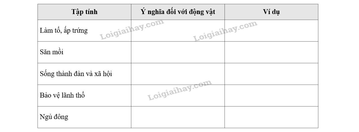 Hoàn thành bảng sau về ý nghĩa của các tập tính ở động vật và cho ví dụ minh họa.