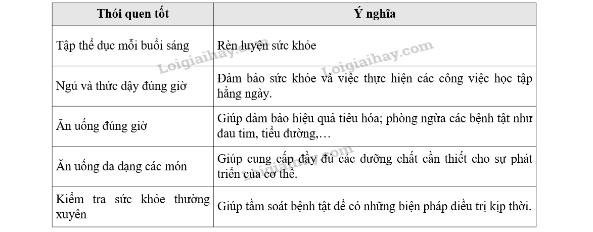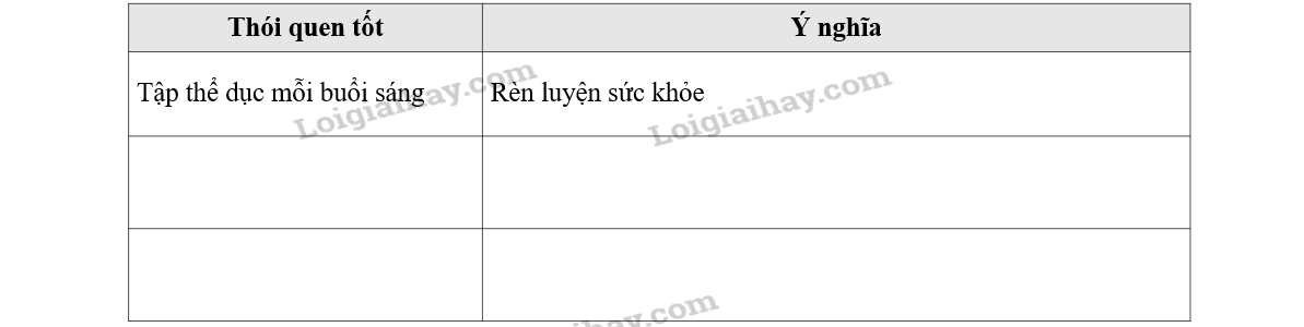 Lấy ví dụ về một số thói quen tốt của em và nêu ý nghĩa của thói quen đó theo gợi ý sau: