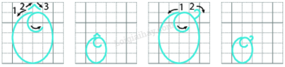 + Bước 1: (Viết như chữ O) Đặt bút trên ĐK dọc 2, giữa hai ĐK ngang 3, 4 viết nét cong kín. Khi chạm điểm đặt bút thì lượn vòng vào trong và dừng bút bên phải ĐK dọc 2, dưới ĐK ngang 3 (ĐK dọc 2 là trục đối xứng của chữ O và nét lượn vòng)