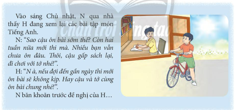 – Nếu là N, em sẽ ứng xử như sau: Vào nhà và cùng ôn bài với H để chuẩn bị tốt cho bài thi Tiếng Anh sắp tới.