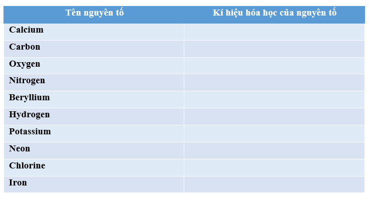Hãy điền các kí hiệu hóa học phù hợp vào các ô tương ứng với tên gọi của nguyên tố