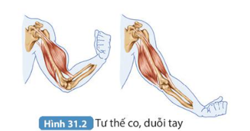 Quan sát Hình 31.2, so sánh tư thế của tay khi cơ co và dãn. Liên hệ kiến thức về đòn bẩy đã học ở bài 19, cho biết tay ở tư thế nào có khả năng chịu tải tốt hơn.