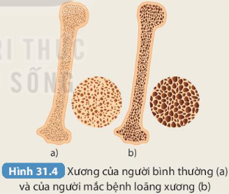 Quan sát Hình 31.4, ta thấy xương của người mắc bệnh loãng xương (b) bị giòn và dễ gãy hơn, vì mật độ xương thưa.