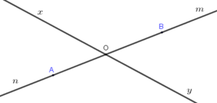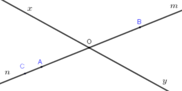 Mà điểm \(A\) thuộc tia \(Om\) và điểm \(B\) thuộc tia \(On\) nên điểm \(O\) nằm giữa hai điểm \(A,B\)