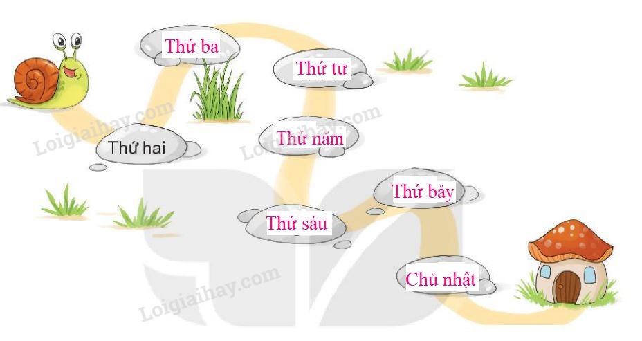 Tìm đường về nhà. Đường về nhà của ốc sên là đường đi qua tất cả các viên đá, mỗi viên đá ghi một ngày trong tuần. Tìm ngày còn thiếu ở mỗi viên đá.