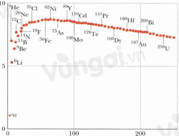 Ta có: Các hạt nhân bền vững có \(\dfrac{{{{\rm{W}}_{lk}}}}{A}\) lớn nhất vào cỡ 8,8 MeV/nuclon; đó là những hạt nhân nằm khoảng giữa của bảng tuần hoàn ứng với \(50 < A < 80\)