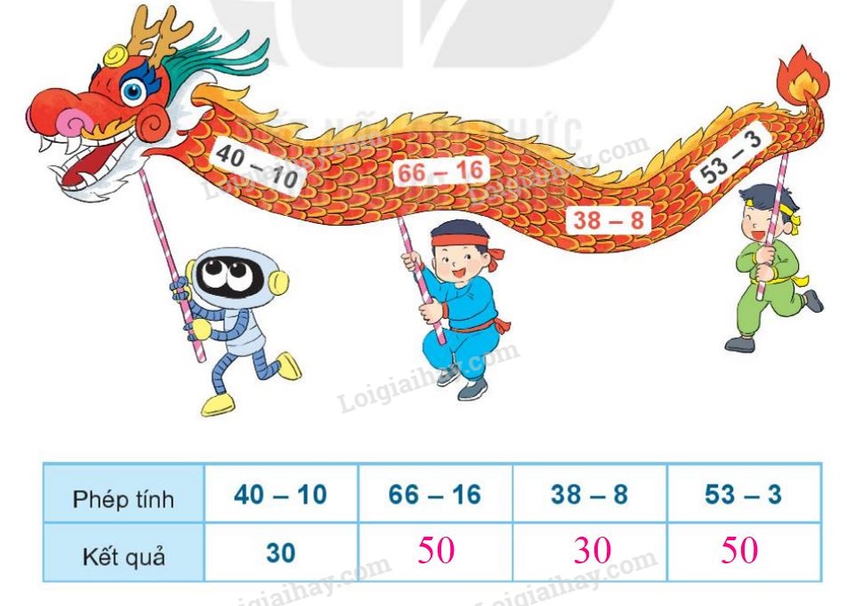 Thực hiện các phép tính ghi trên con rồng rồi điền kết quả vào bảng.